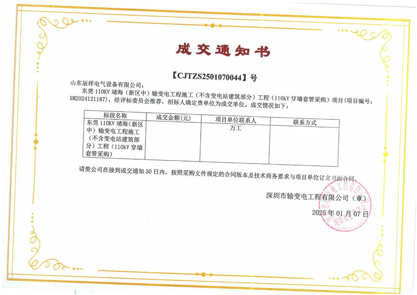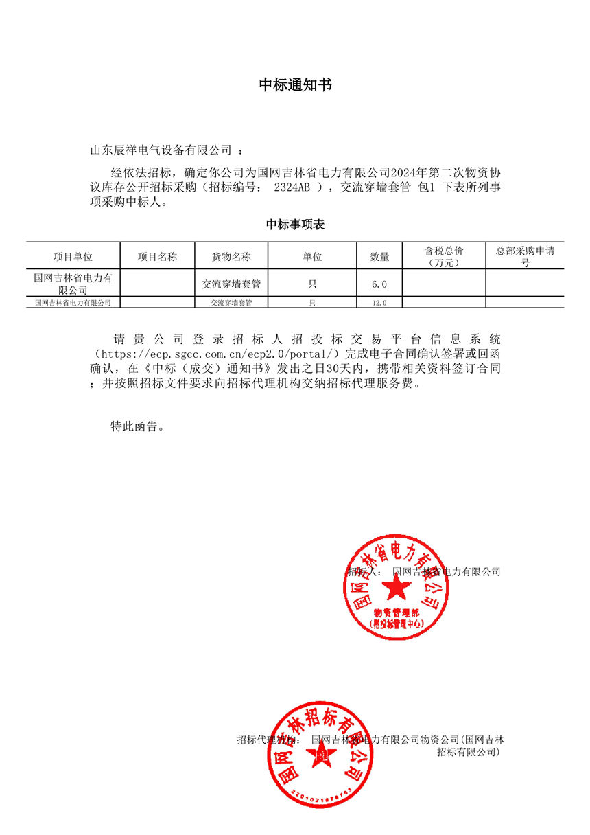 交流穿墻套管中標通知書